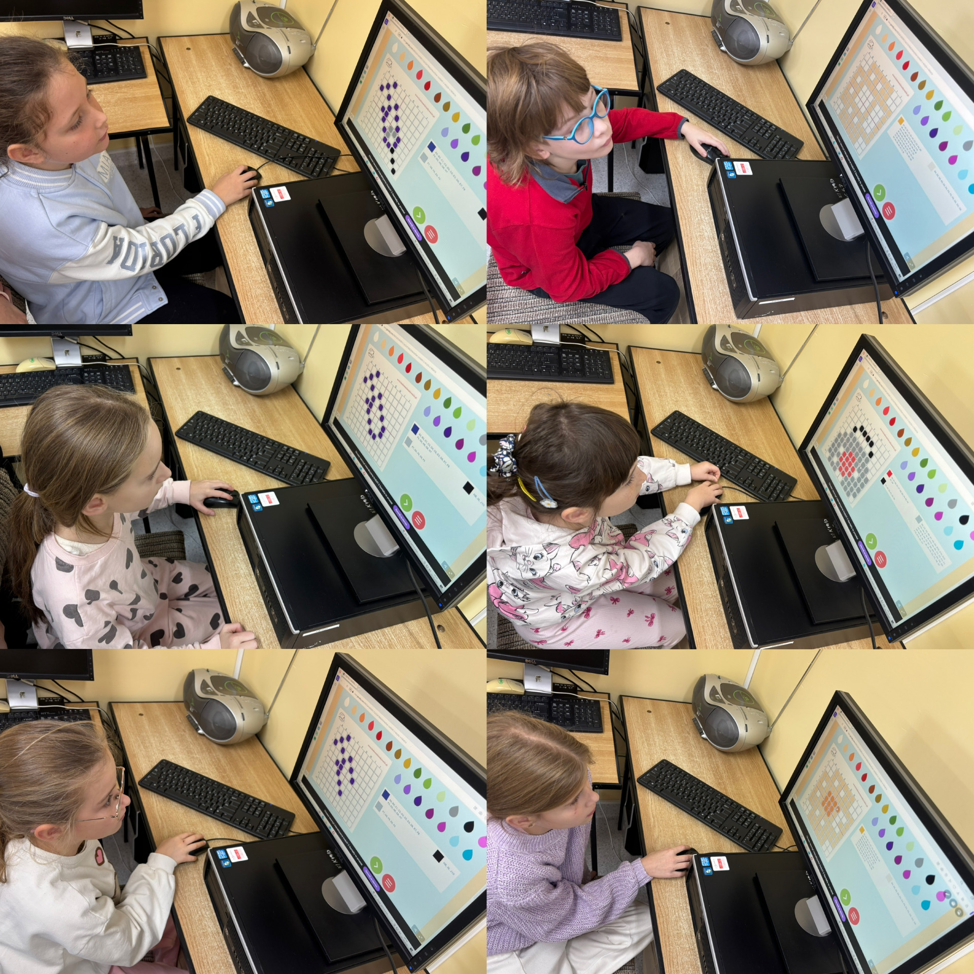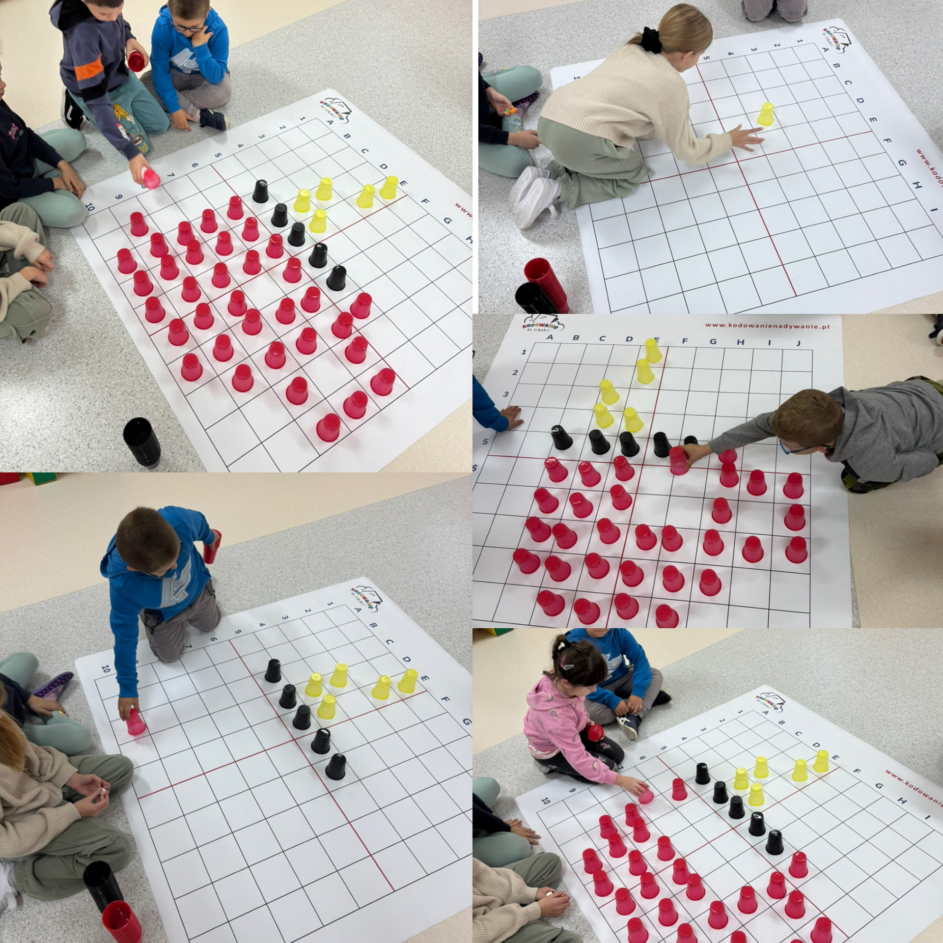 Dzieci tworzyły obrazki z pikseli i kubeczków według współrzędnych, kodowały zgodnie z kolorami pól, odczytywały i układały własne kody, a także rozwiązywały labirynty.