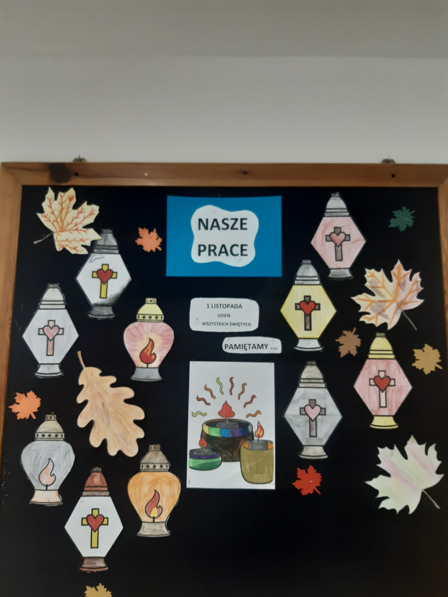 Listopad rozpoczęliśmy w nastroju zadumy, wspominając naszych bliskich, którzy odeszli. Polska tradycja nakazuje odwiedzanie w tym dniu grobów swoich bliskich, zapalenie zniczy, złożenie kwiatów. Uczniowie rozmawiali o tradycji odwiedzania grobów bliskich, zapalenia zniczy, złożenia kwiatów oraz jak należy zachować się na grobach. Dzieci wykonywały znicze wykorzystując do tego różne materiały.