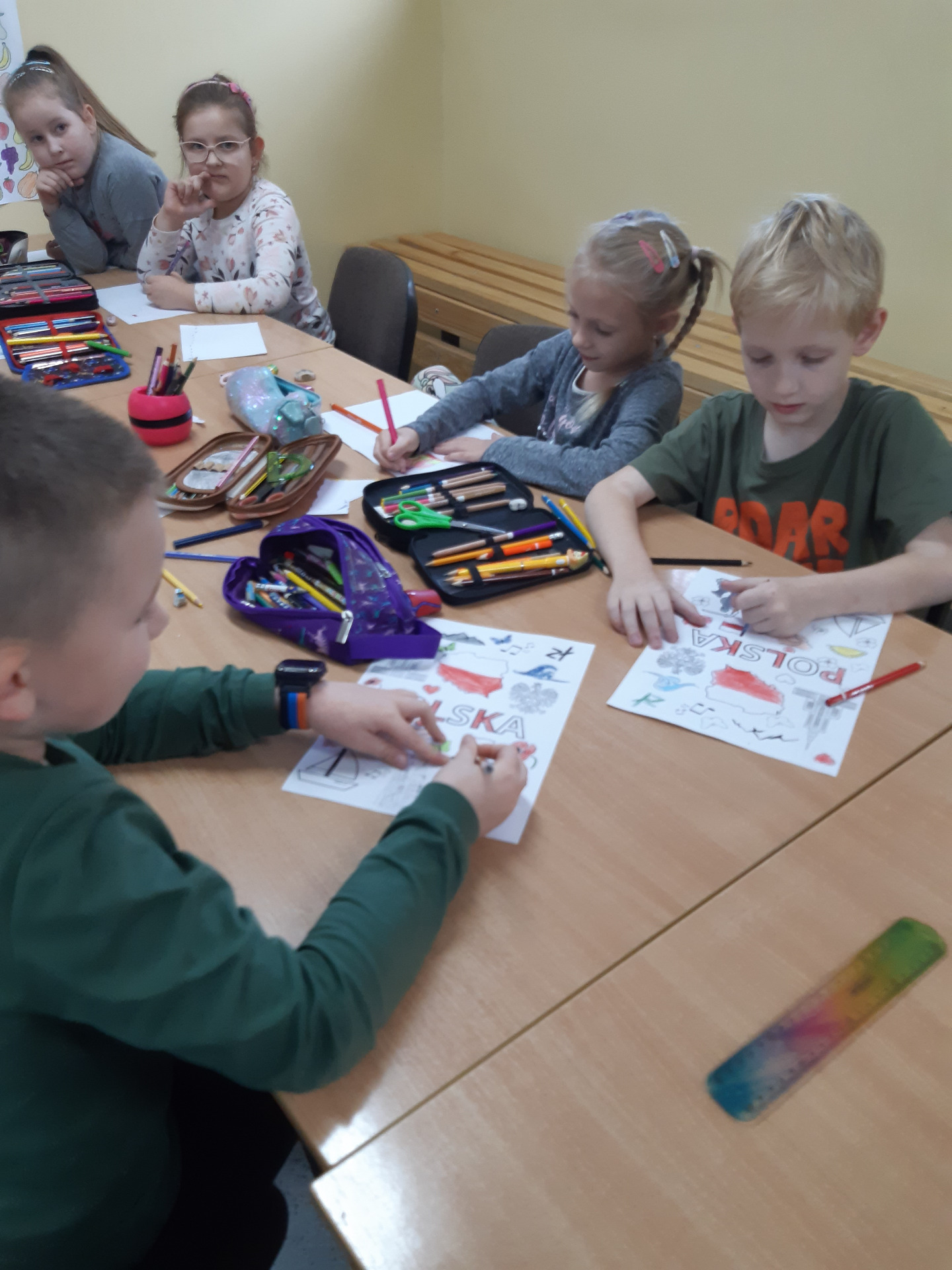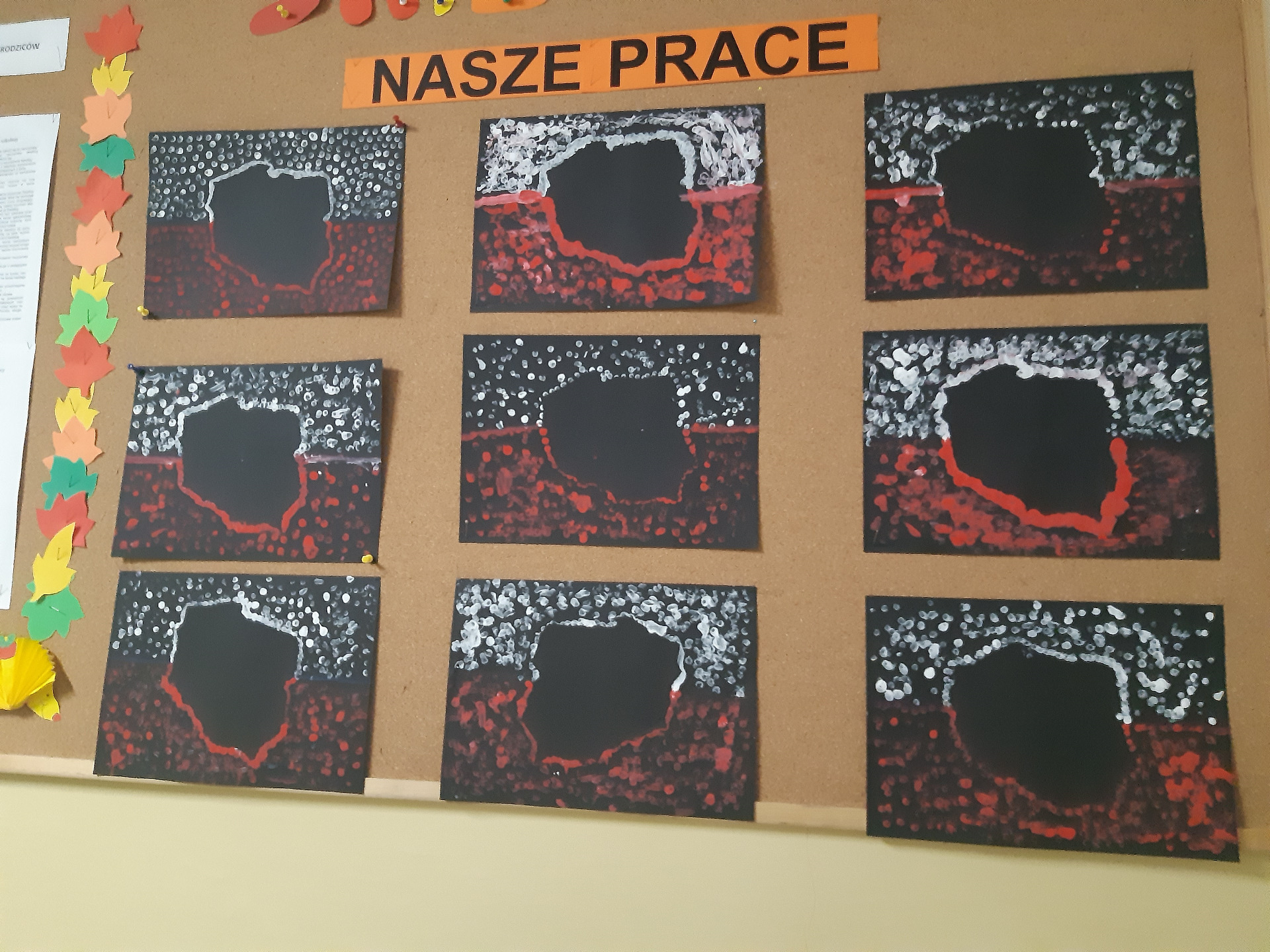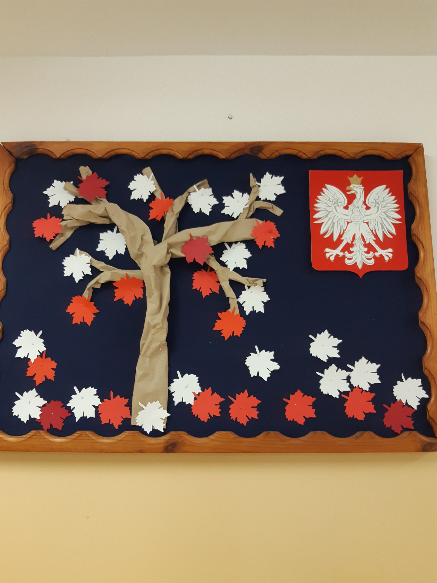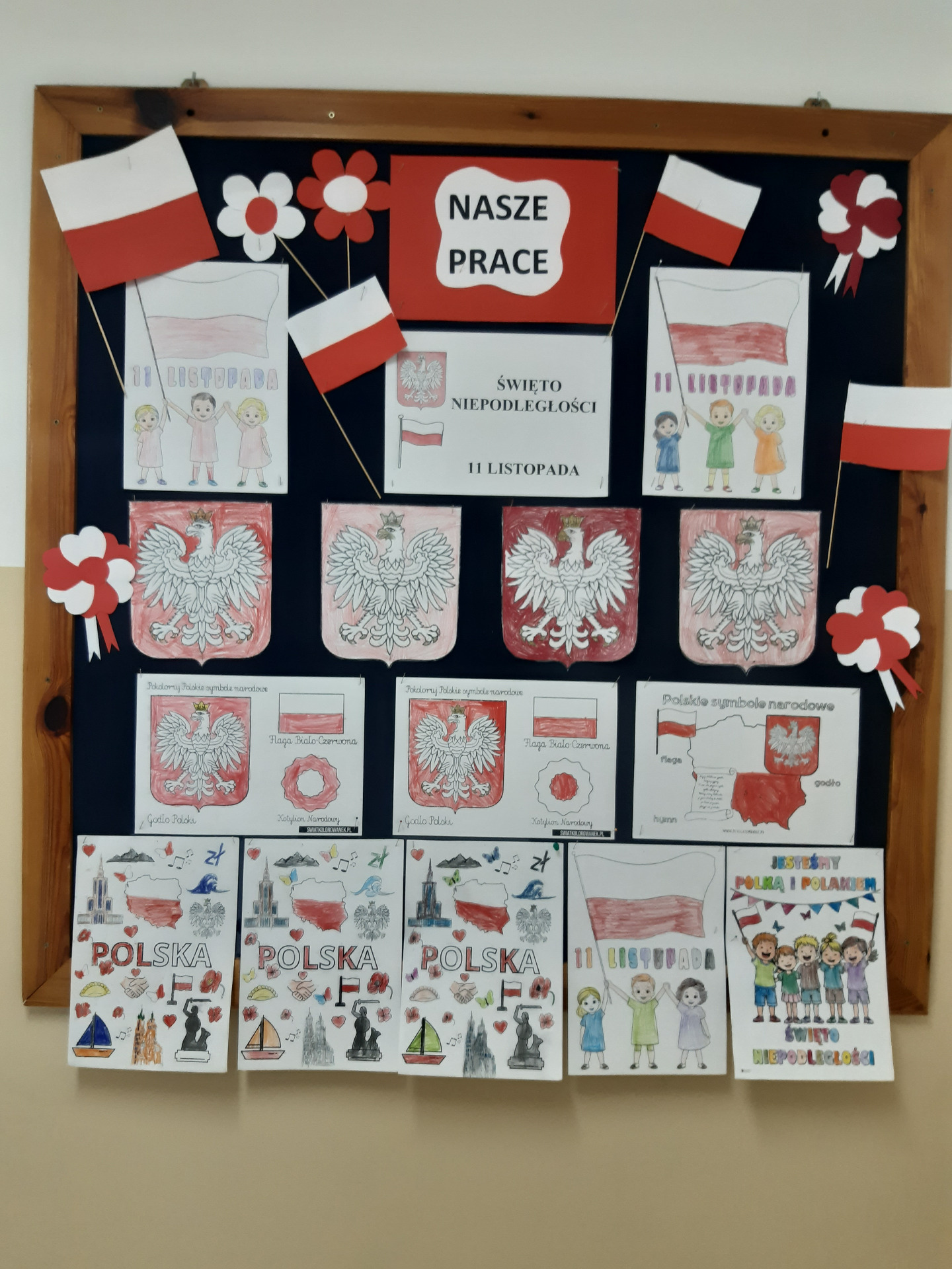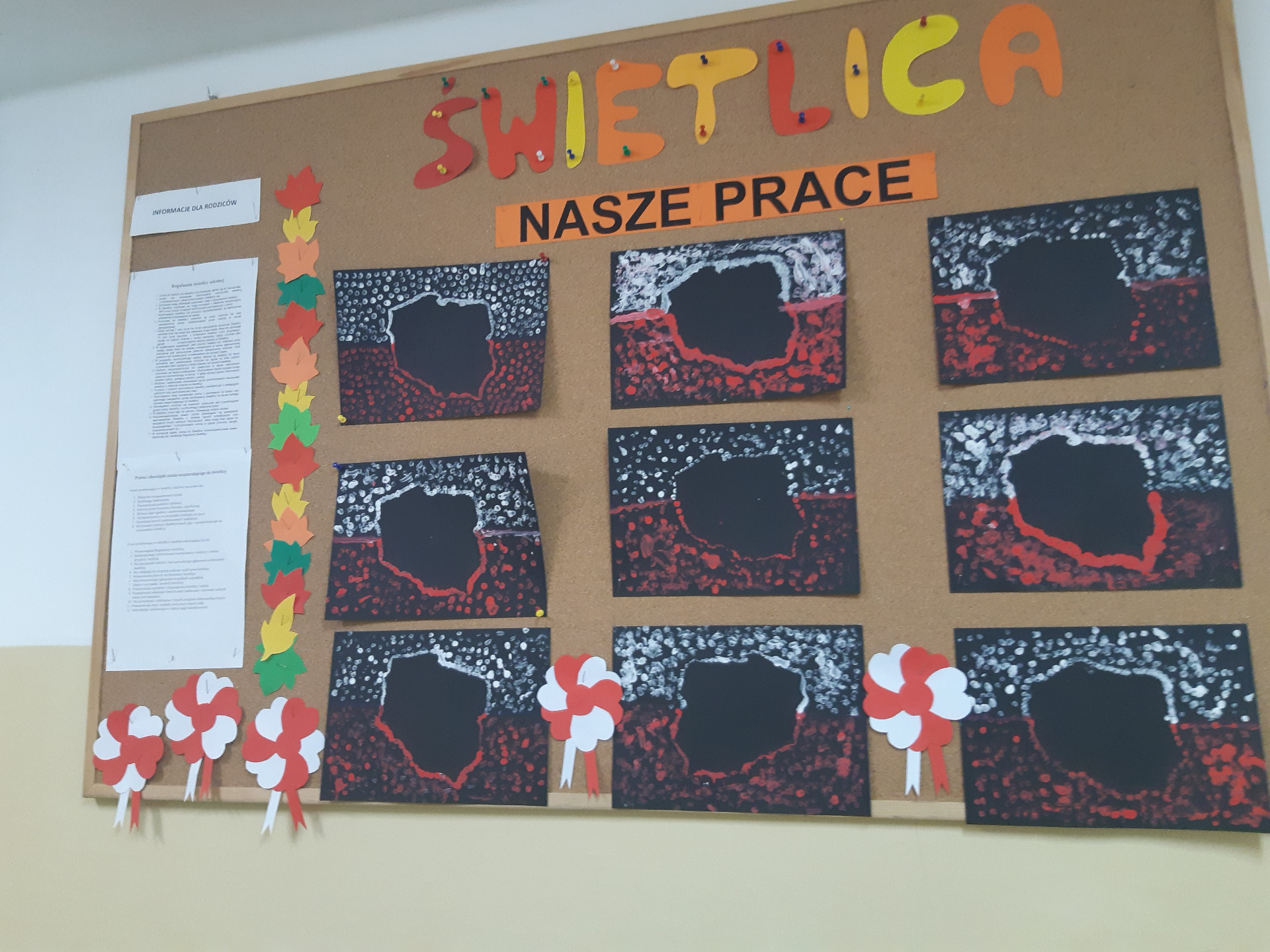 Pamiętaliśmy także o wydarzeniach historycznych - uczciliśmy odpowiednią dekoracją, a także rozmowami tematycznymi - Święto Niepodległości. Z okazji dnia 11 listopada dzieci świetlicowe poznały symbole narodowe Polski, śpiewały Hymn Polski. Wykonały pracę plastyczną “Godło Polski”, piękne kotyliony, kolorowały rysunki o tematyce patriotycznej.