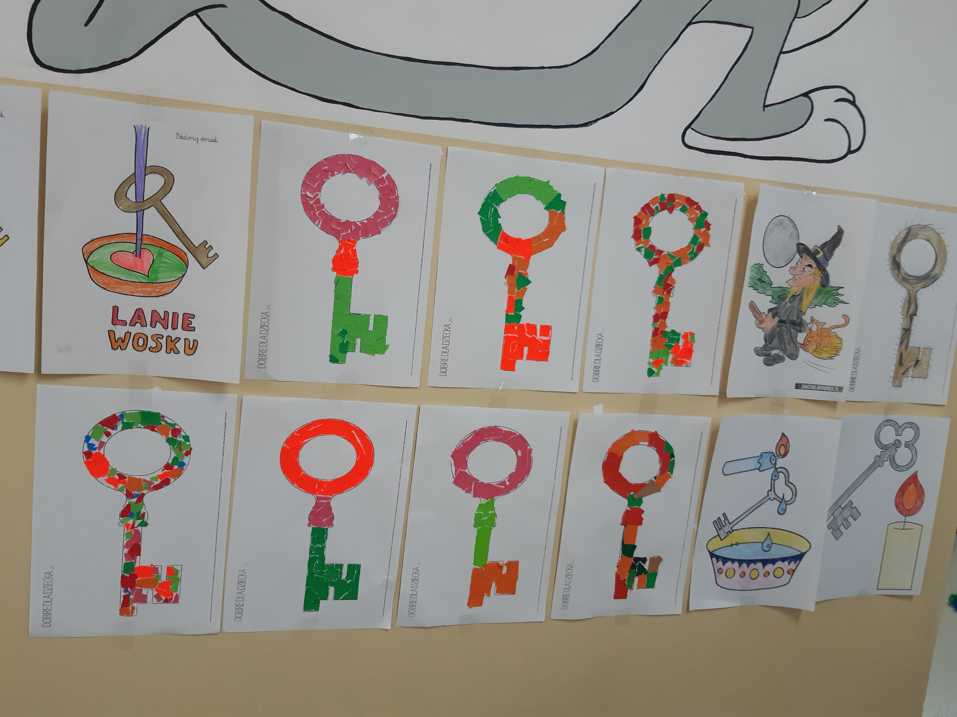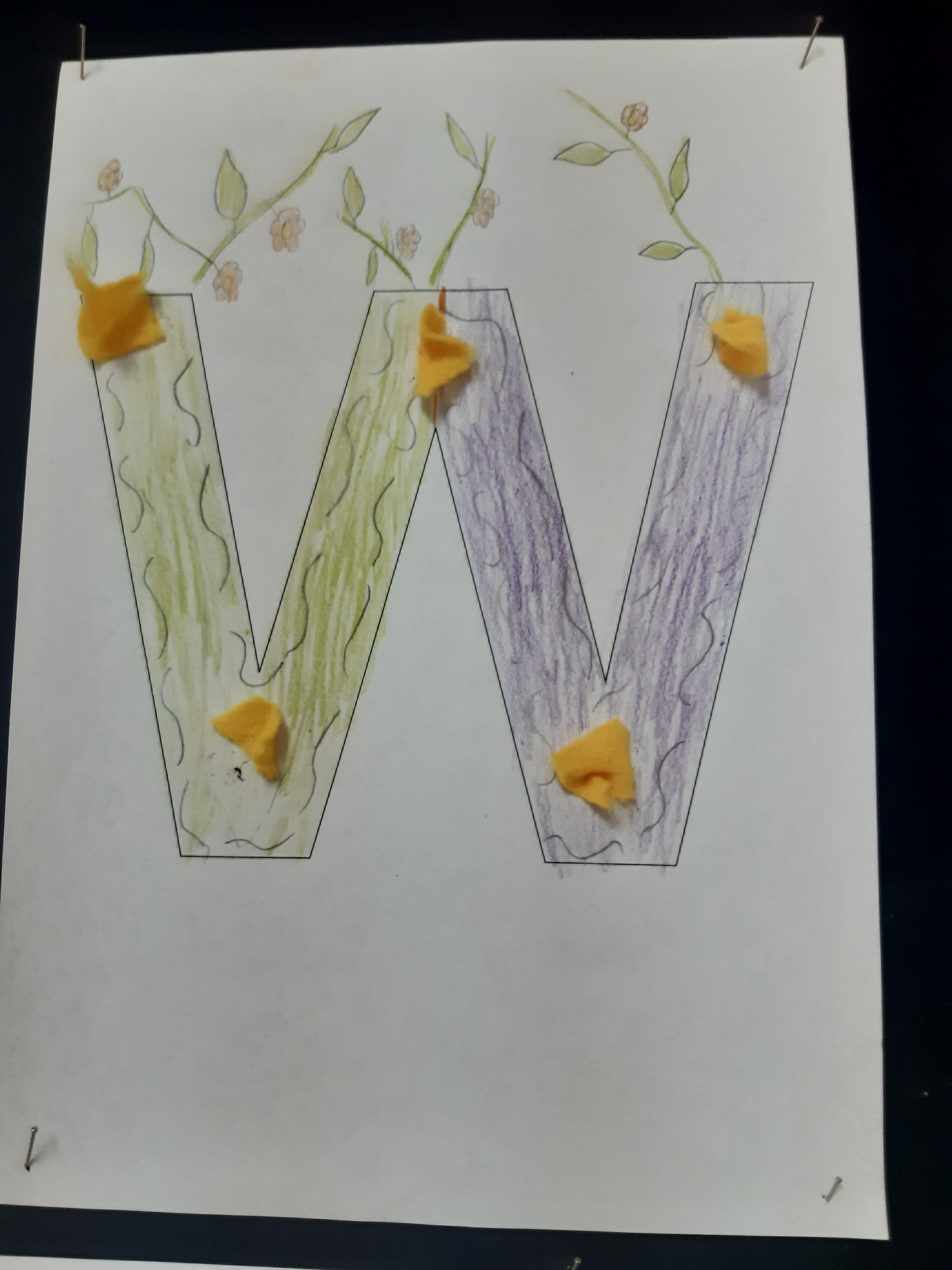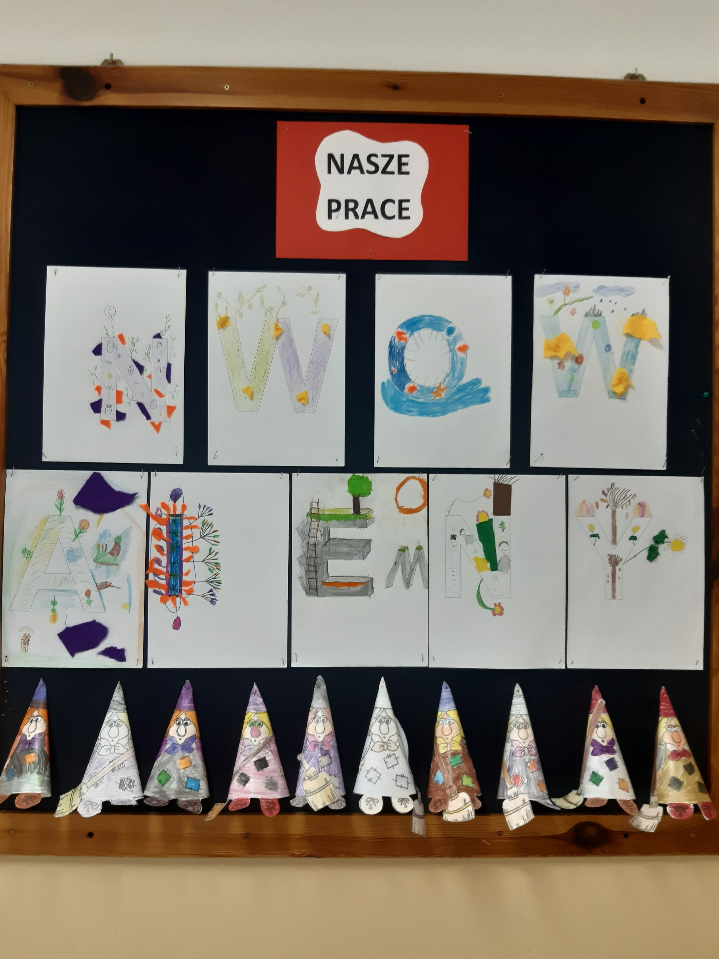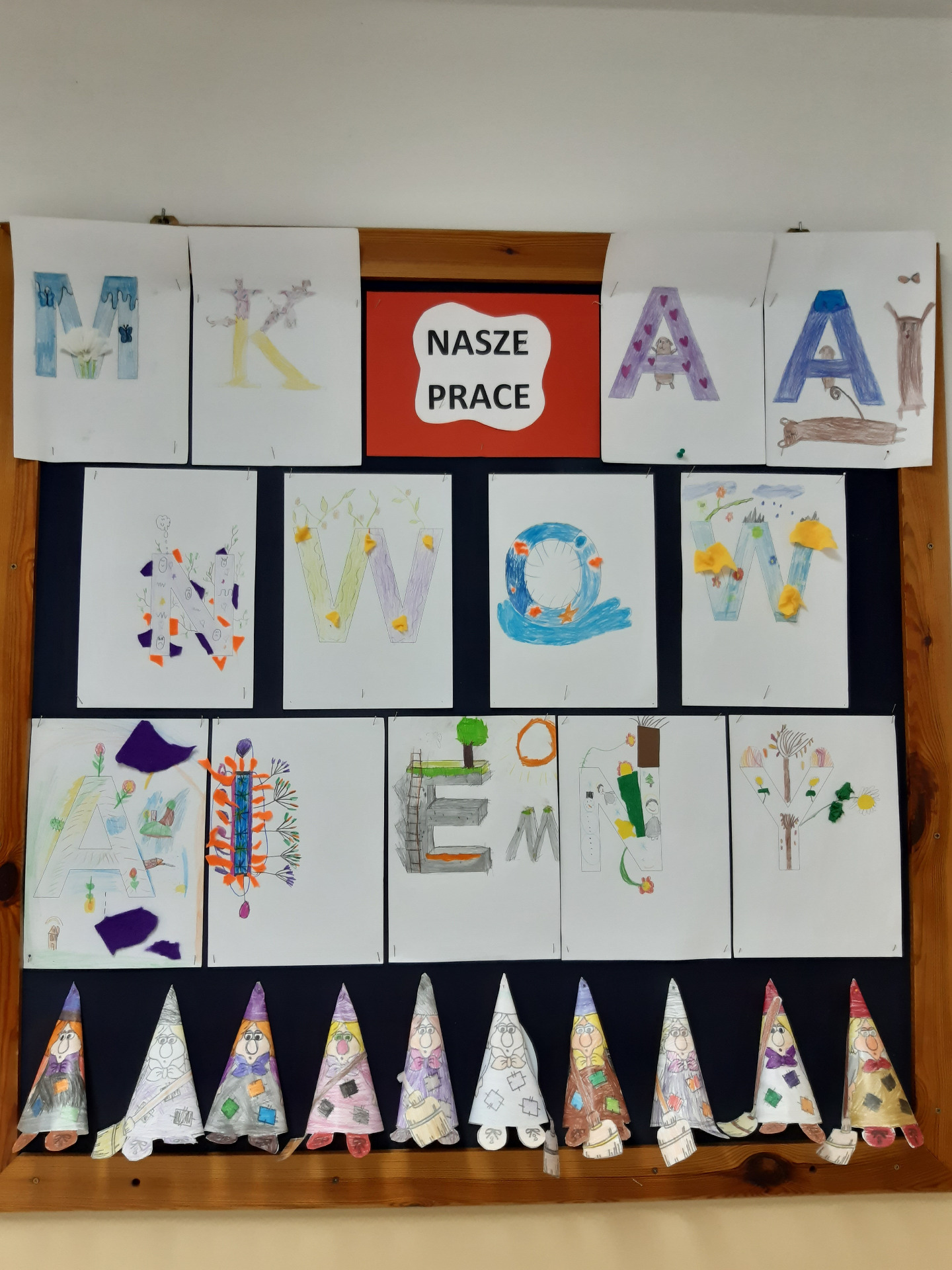 Obchodziliśmy również Święto Imion - uczniowie ozdabiali litery przez tworzenie kolaży z różnych materiałów na wydrukowanej literze, malowali kredkami i tworzyli własne wzory.