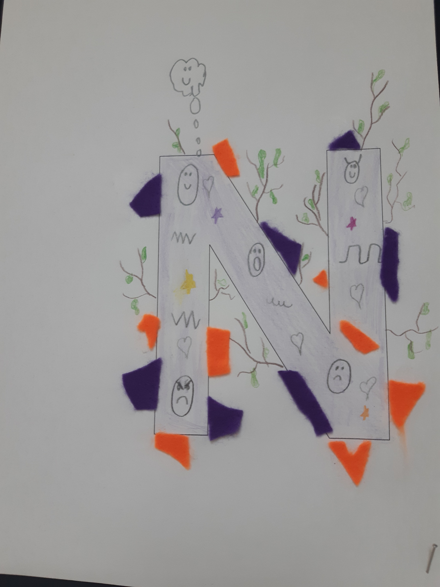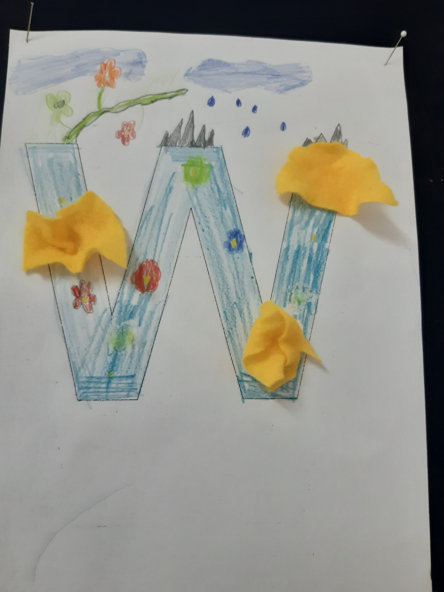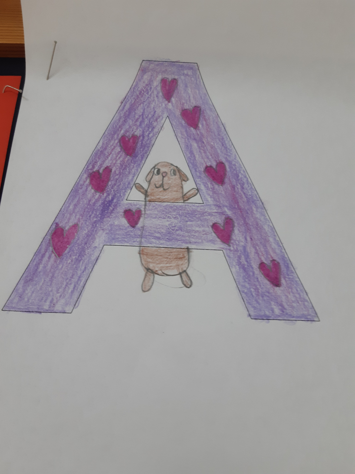 Obchodziliśmy również Święto Imion - uczniowie ozdabiali litery przez tworzenie kolaży z różnych materiałów na wydrukowanej literze, malowali kredkami i tworzyli własne wzory.
